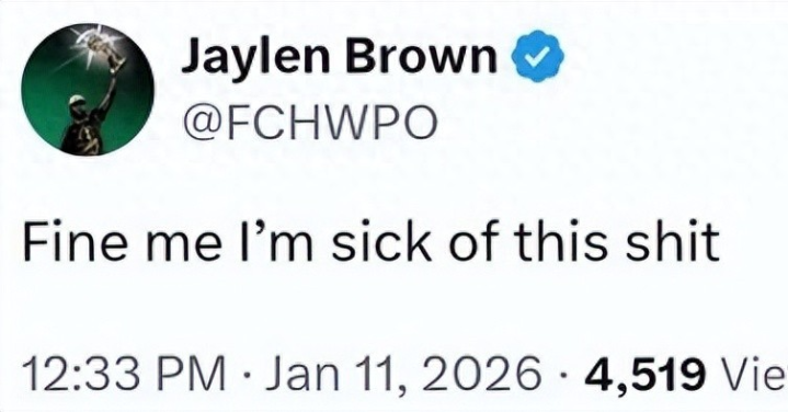 凯尔特人球星杰伦·布朗,主动要求联盟对他罚款,他也求锤得锤,被罚了3.5万美金。事情的起因,是1月11日主场对战马刺,绿军全队整场仅获4次罚球。布朗在采访中怒喷裁判双标,致使绿军憾负5分。更在推特上喊话:“罚我款吧,我早就受够了这些破事。”