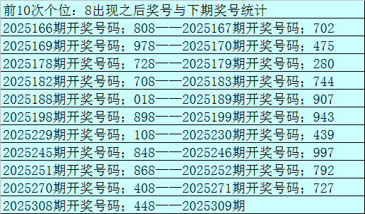 上期回顾:福利彩票3D第2025308期开奖结果:奖号为448,奖号和值为:16,奖号跨度为:4,奇偶形态为:偶偶偶,大小形态为:小小大。