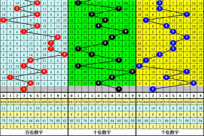 跨度:近5期跨度分布在3-6之间,振幅为4点,出现比较密集,上期跨度为4,下降1点,本期注意跨度走大,关注5区段。